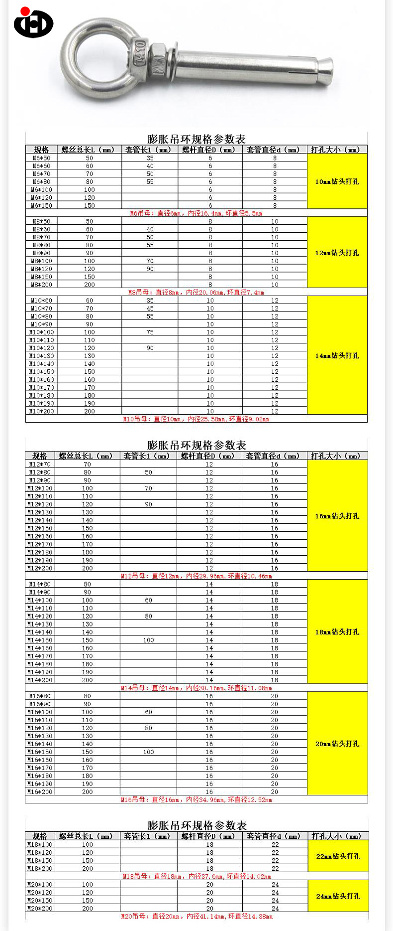 A nagy teherbírású szemcsavarhorgony megvastagodott, 304 rozsdamentes acélból készült, 400 mPa -os szakítószilárdsággal, és ellenáll a szakító erőknek, több száz kilogrammtól több tonnáig. Függetlenül attól, hogy szerelhető kanapék, ruhásvonalak, nehéz világítótestek, vagy ipari berendezések és védőkorlát beszerelése, megbízható rögzített támogatást nyújthat.